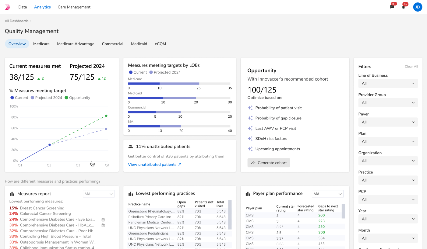 Intelligent algorithms enrich the data the previous stage with deep insights. Out of the box, this includes each patient’s disposition toward quality measures (numerator, denominator, exclusions), risk and social vulnerability profiles, gaps in care, engagement data, next best actions, and more.