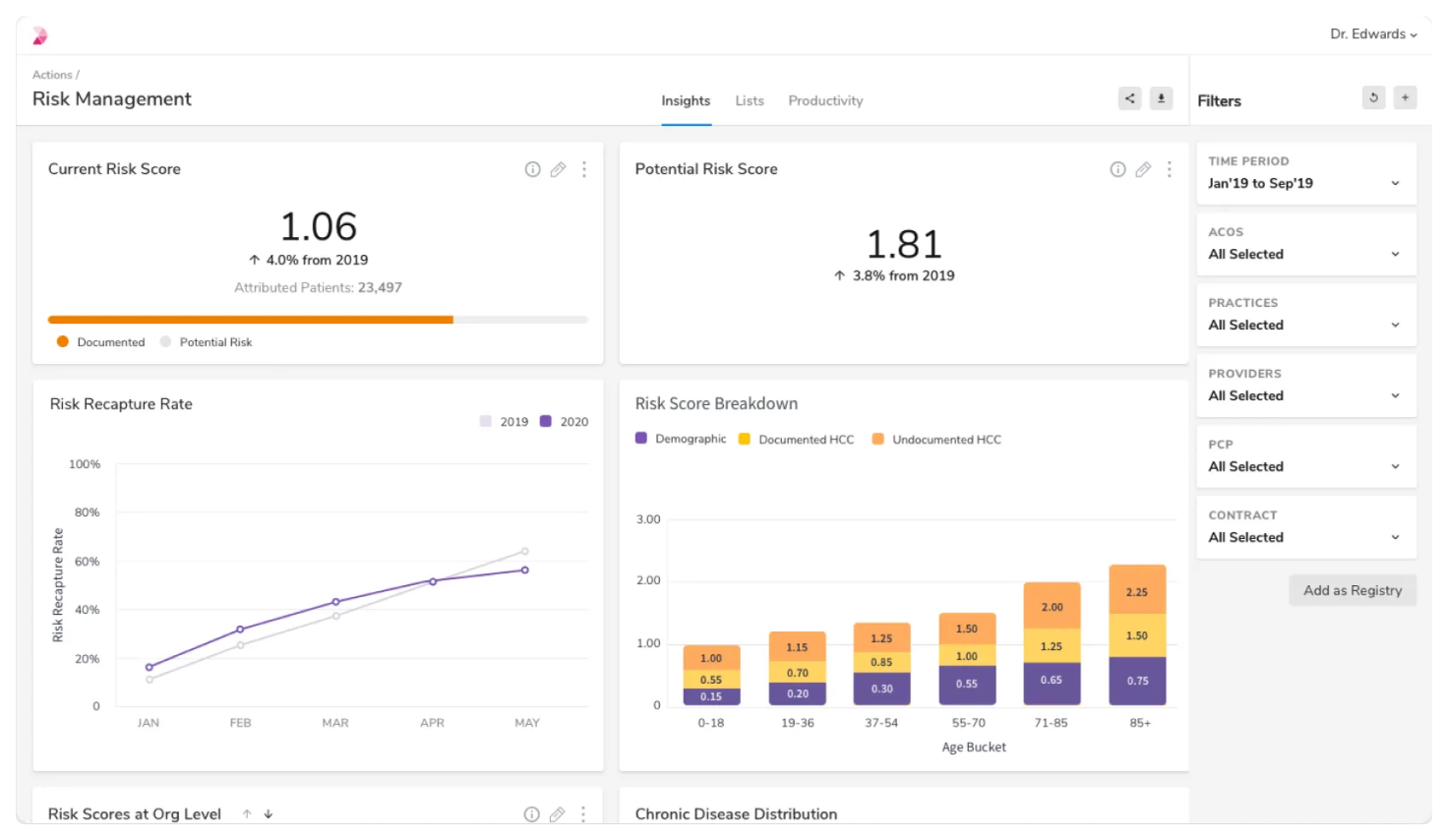 Intelligent algorithms enrich the data the previous stage with deep insights. Out of the box, this includes each patient’s disposition toward quality measures (numerator, denominator, exclusions), risk and social vulnerability profiles, gaps in care, engagement data, next best actions, and more.